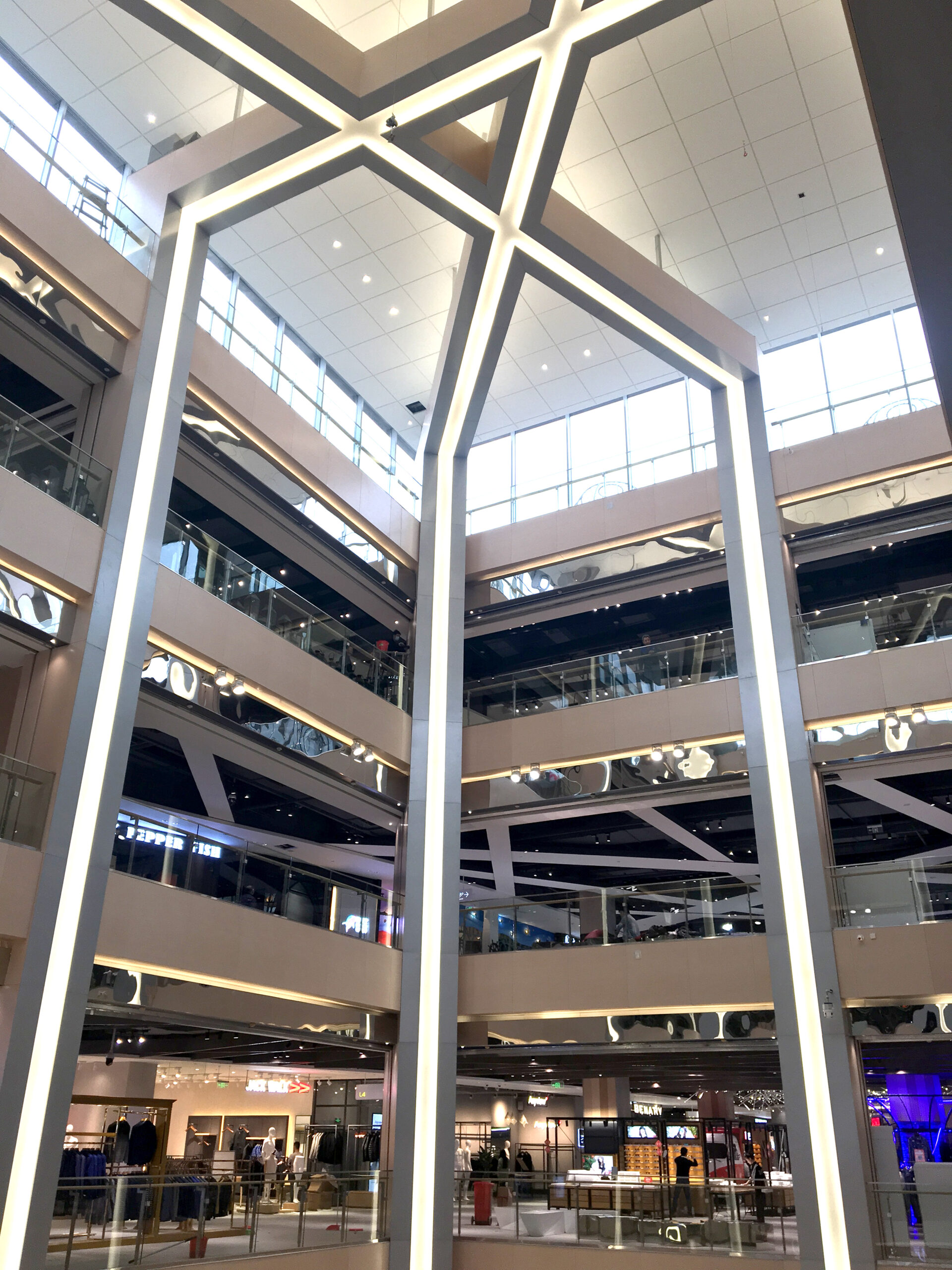大規模な吹き抜け空間からフロアごとに異なるMDに対応した空間設計、統一設計のテナント設計を行う。