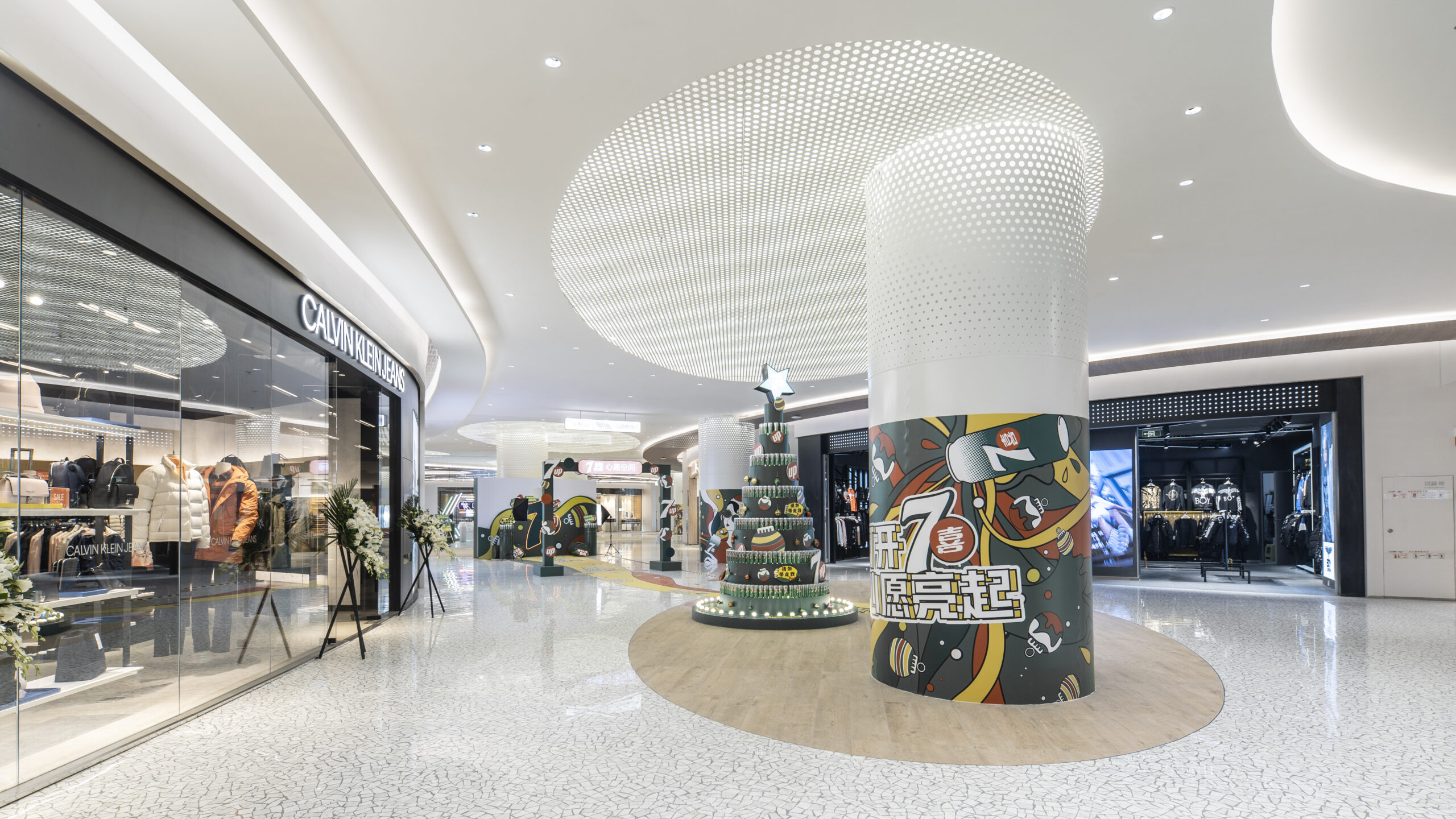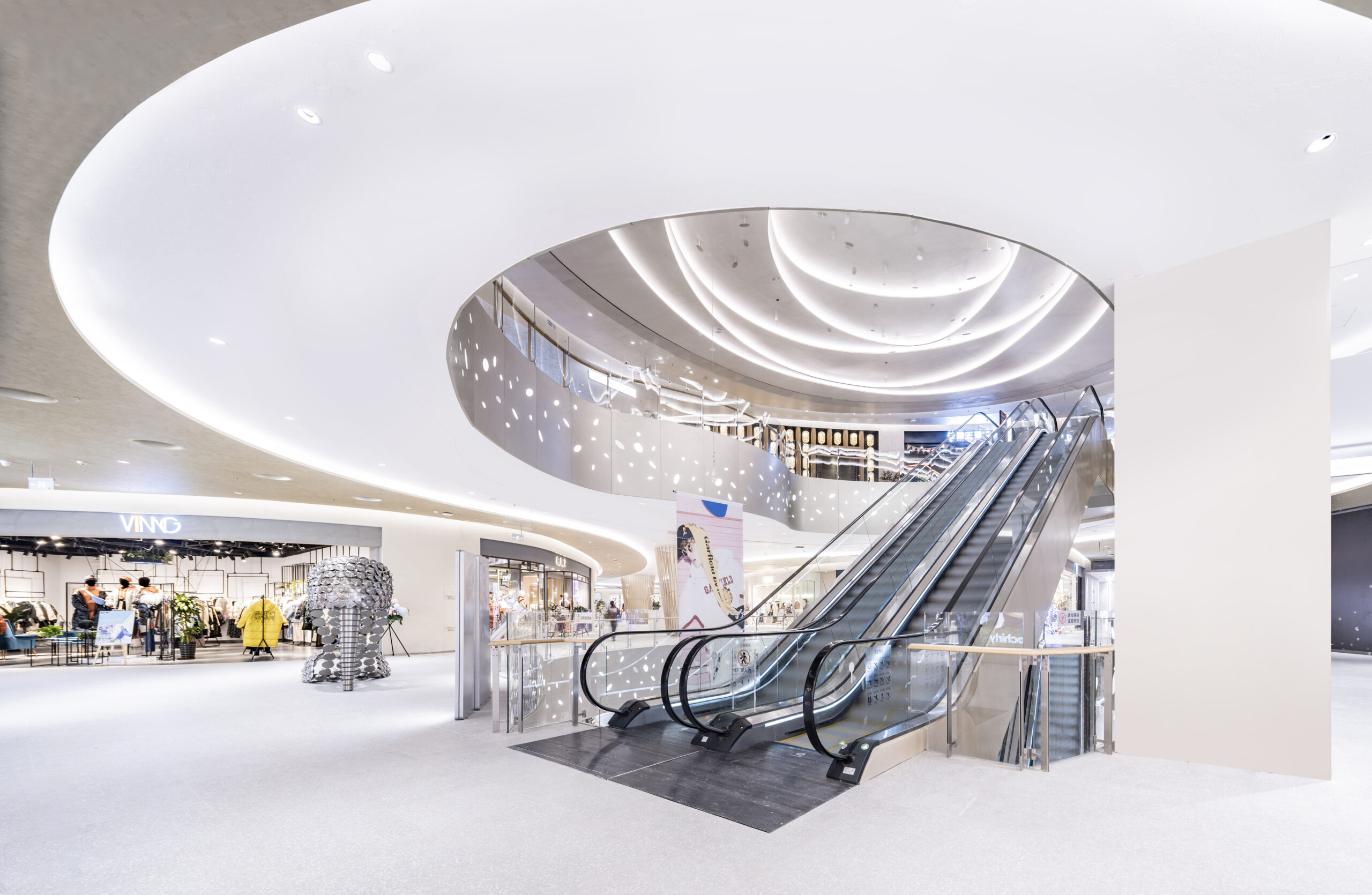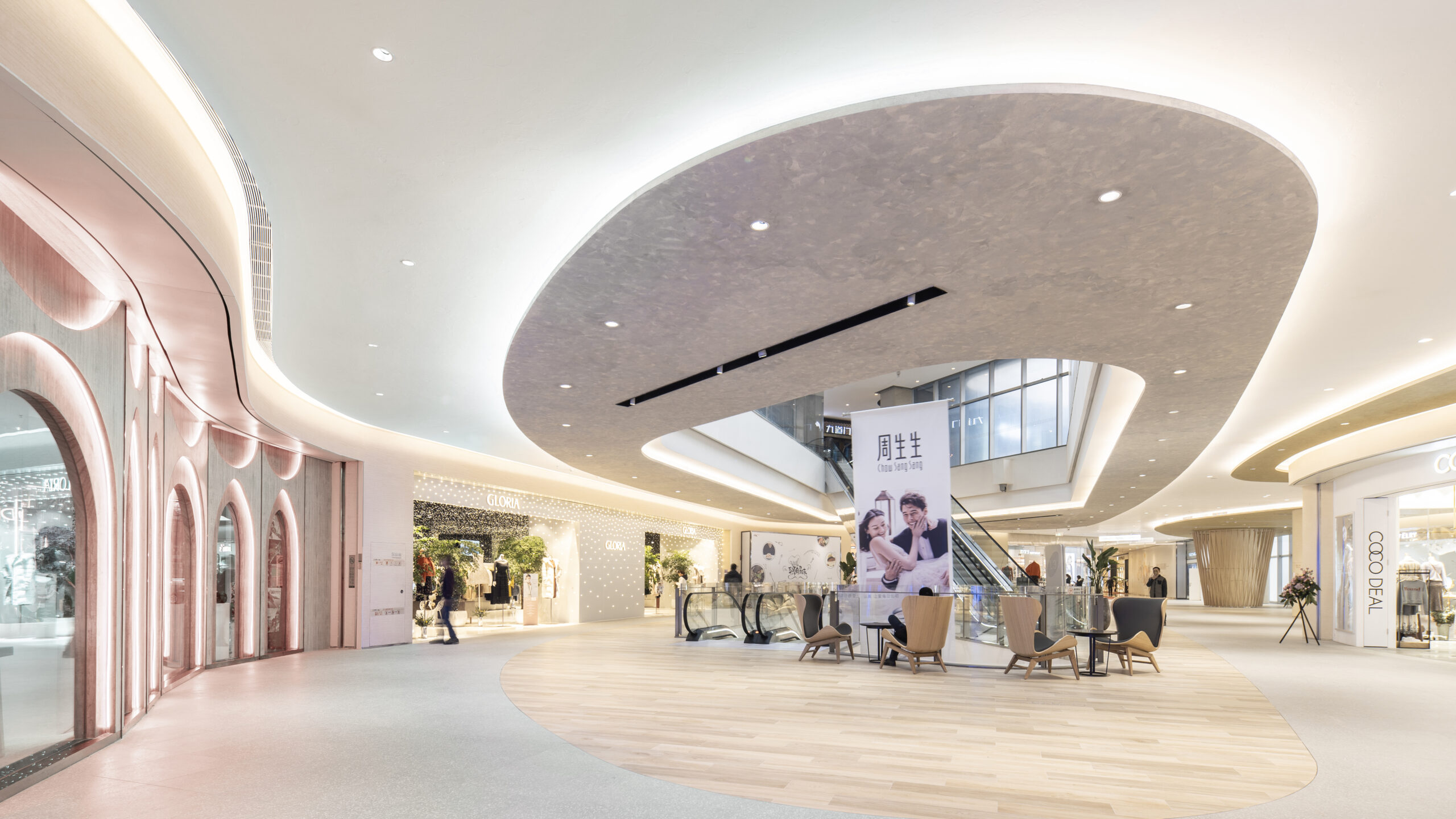 改装エリアのテーマは「若者の感性と自然の融合」。メインとなる吹き抜け空間では、重慶市の市花である「山茶花」をモチーフに、光の露が煌めくような表情を演出した。各フロアはそれぞれのMDに合わせたテーマを持ち、全体としては現代的でありながら温かみを感じる素材選定と柔らかなライン構成により、吹き抜けを中心に穏やかな風が流れ込むような空間を目指した。