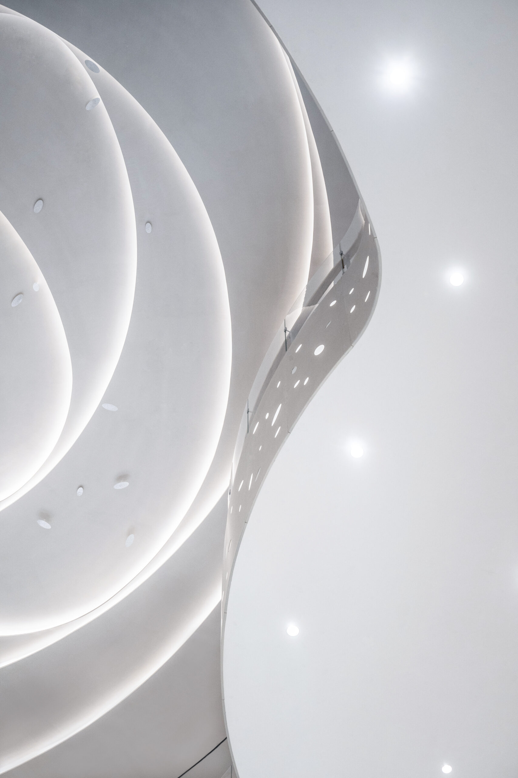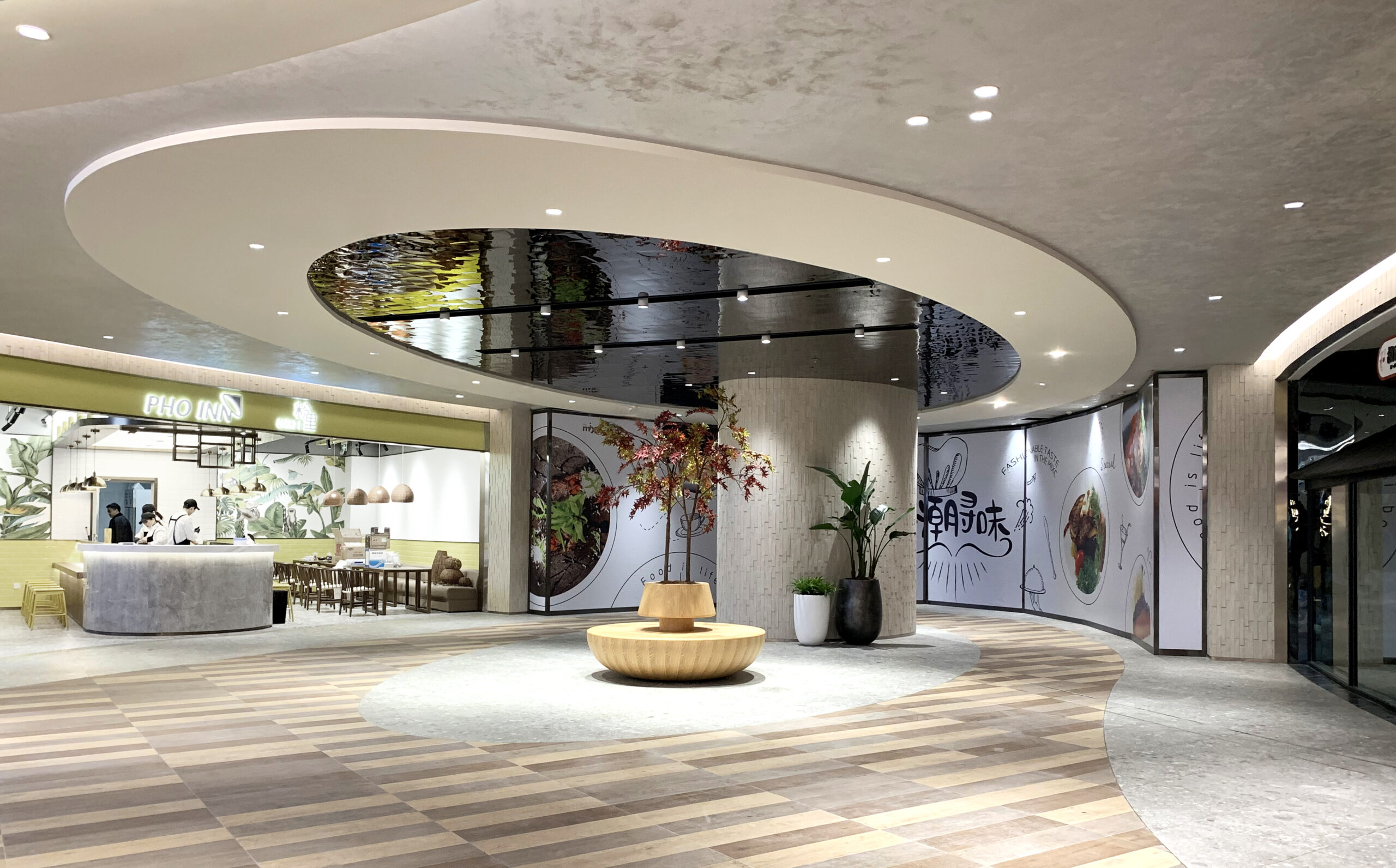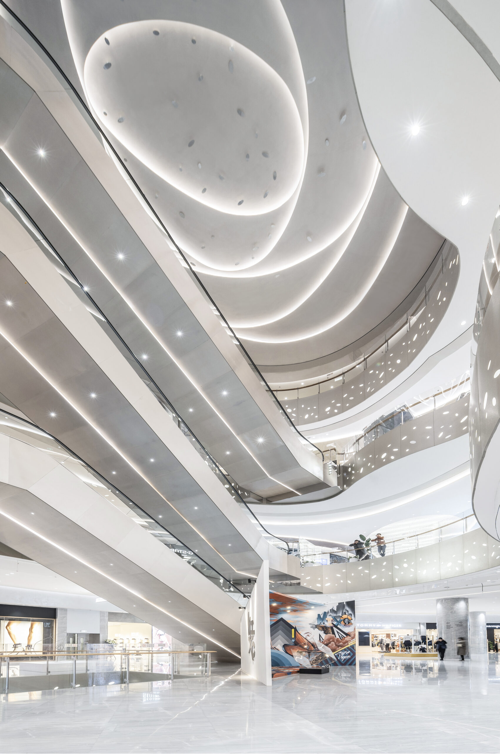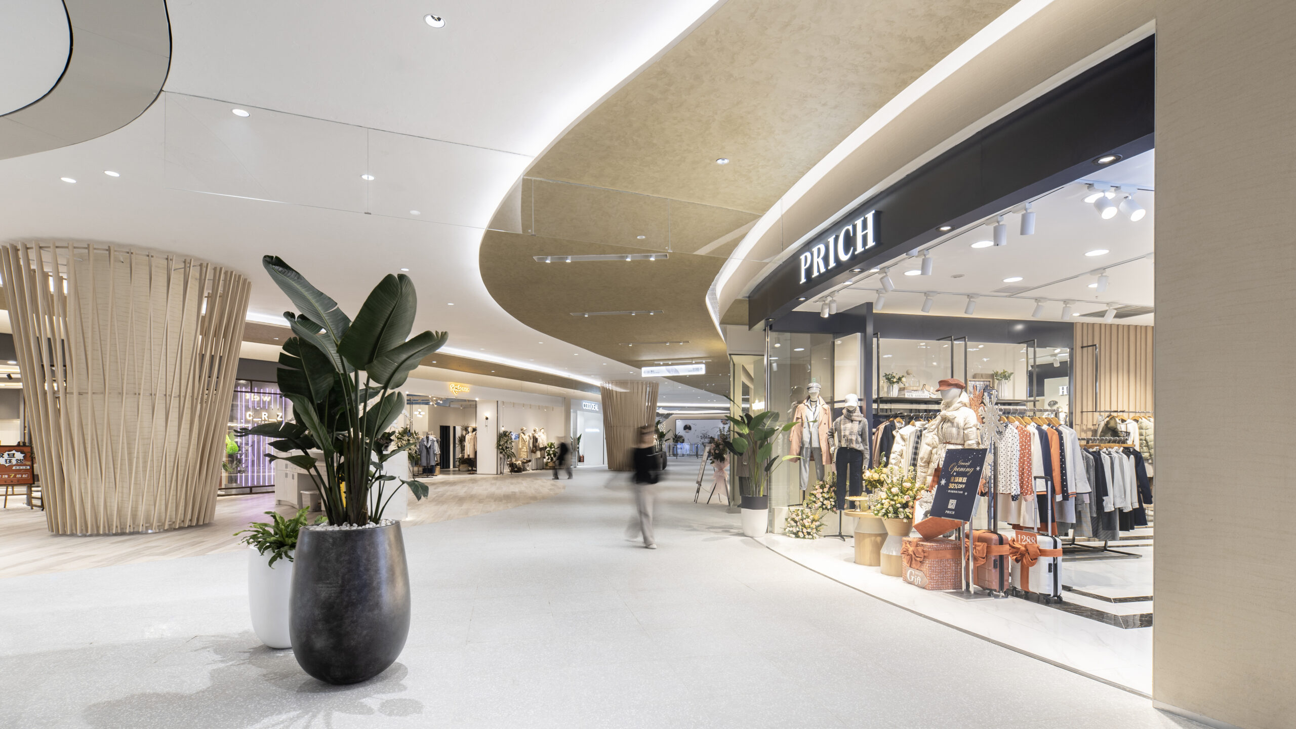 改装エリアのテーマは「若者の感性と自然の融合」。メインとなる吹き抜け空間では、重慶市の市花である「山茶花」をモチーフに、光の露が煌めくような表情を演出した。各フロアはそれぞれのMDに合わせたテーマを持ち、全体としては現代的でありながら温かみを感じる素材選定と柔らかなライン構成により、吹き抜けを中心に穏やかな風が流れ込むような空間を目指した。
