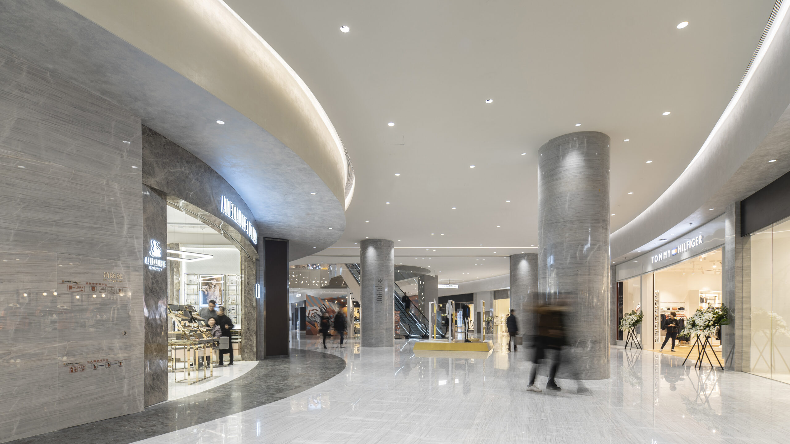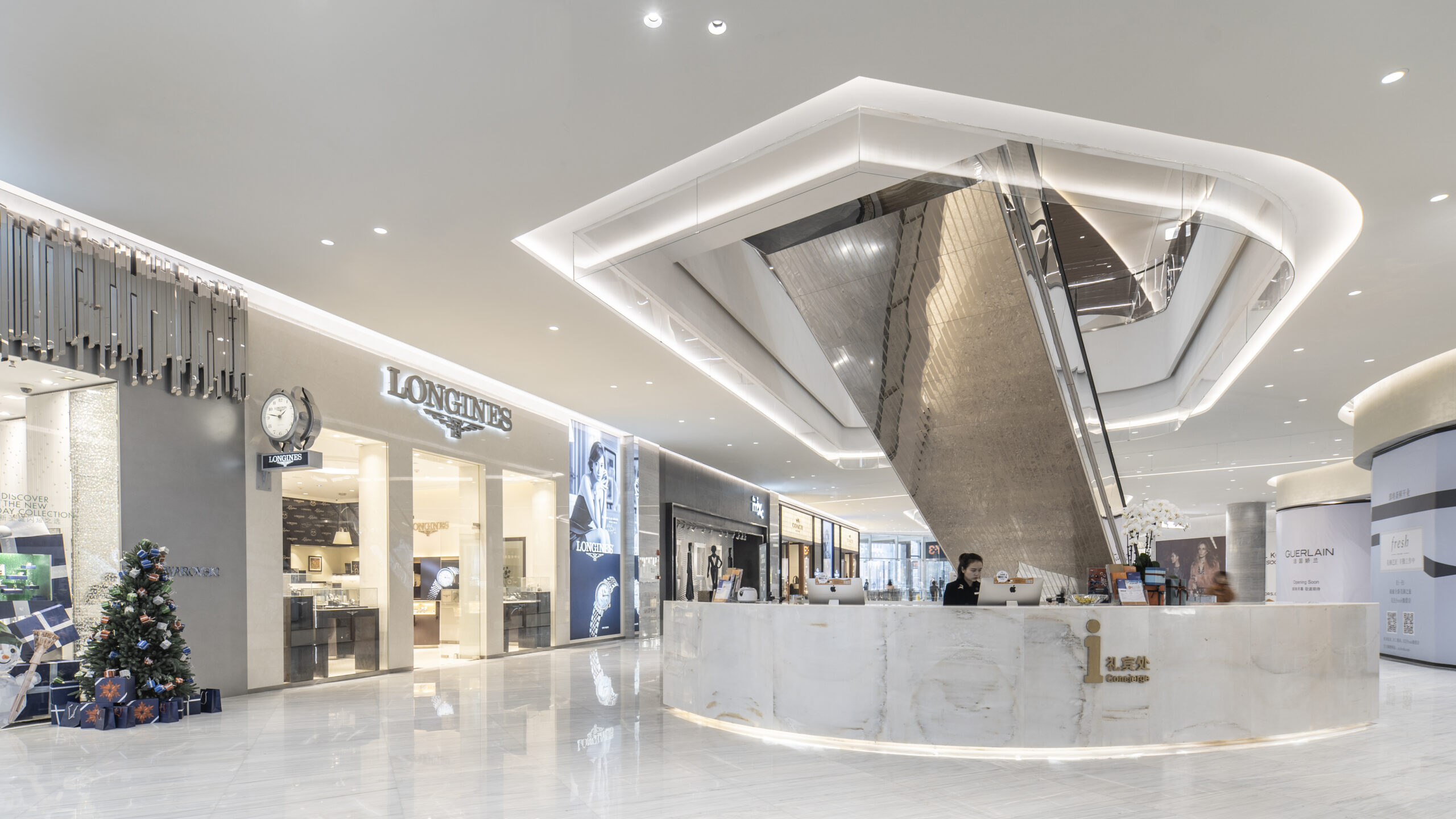 中国・重慶市の「重慶万象城」内に位置する百貨店エリアの改装プロジェクト。設計対象は地下1階から地上4階までの範囲で、各フロアは改装中も営業を続けるショッピングセンターと接続されているため、明確な境界を設けにくい空間構成となっていた。そのため、新旧のデザインの間に歪なギャップが生じないよう、細心の注意を払って計画を進めた。