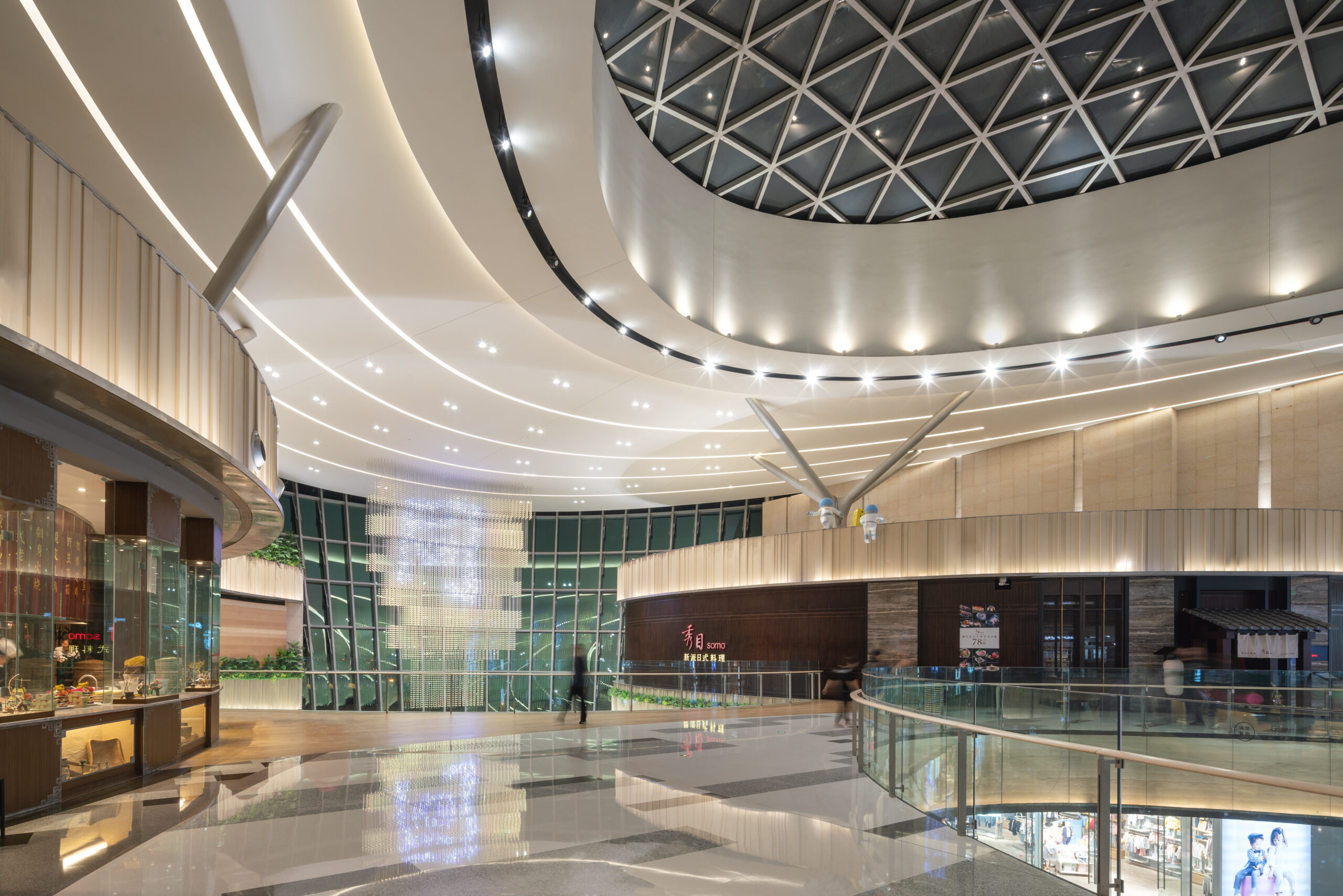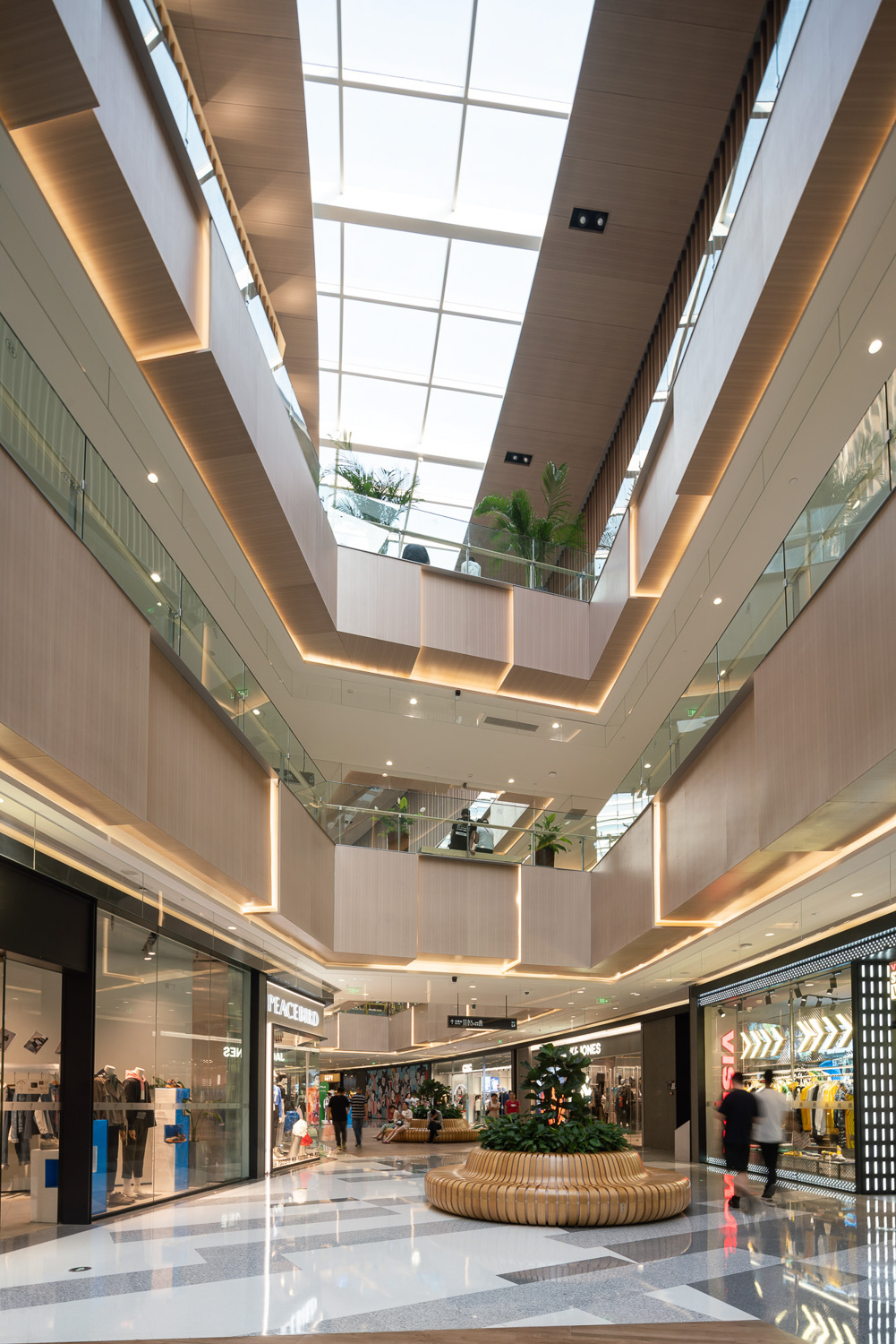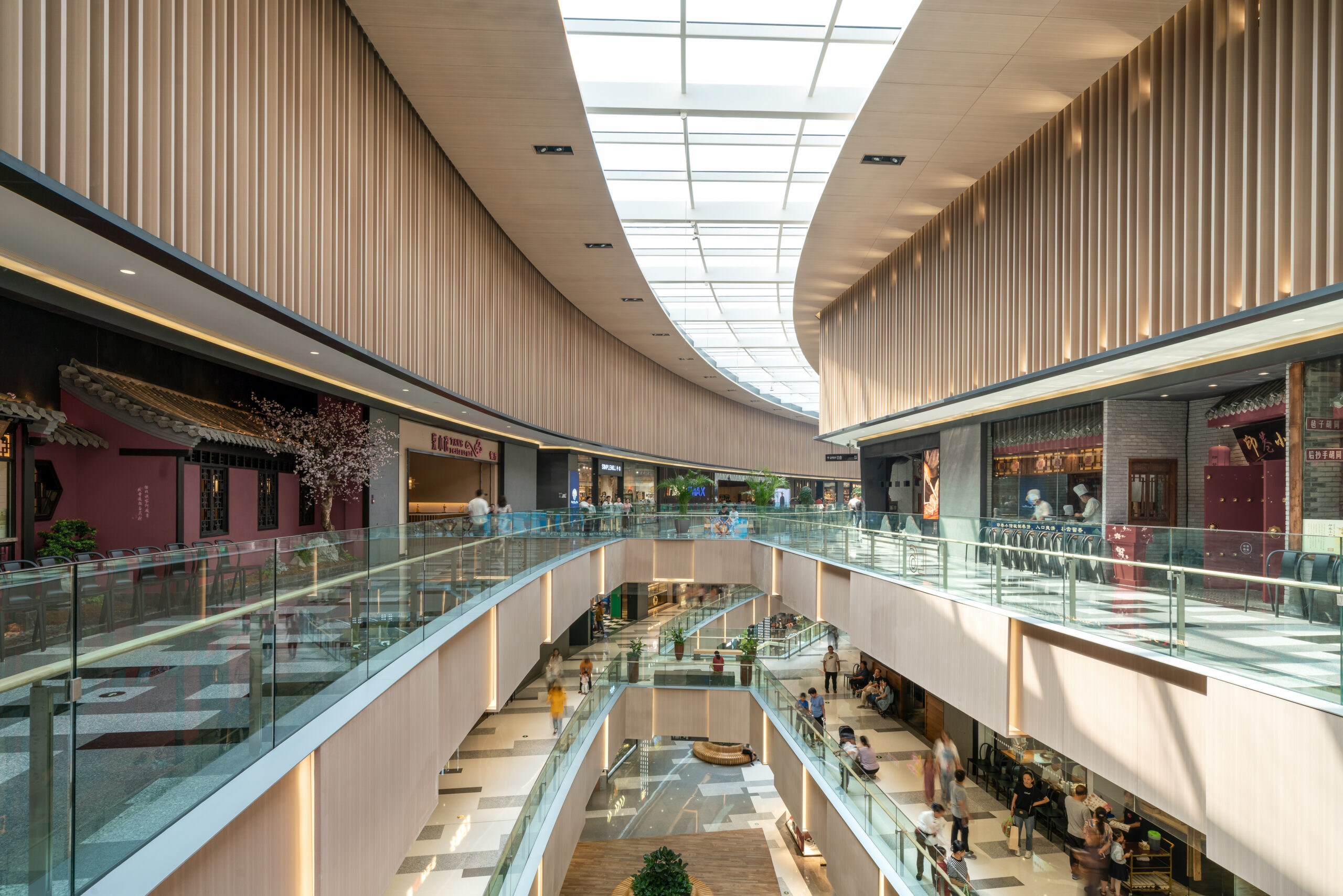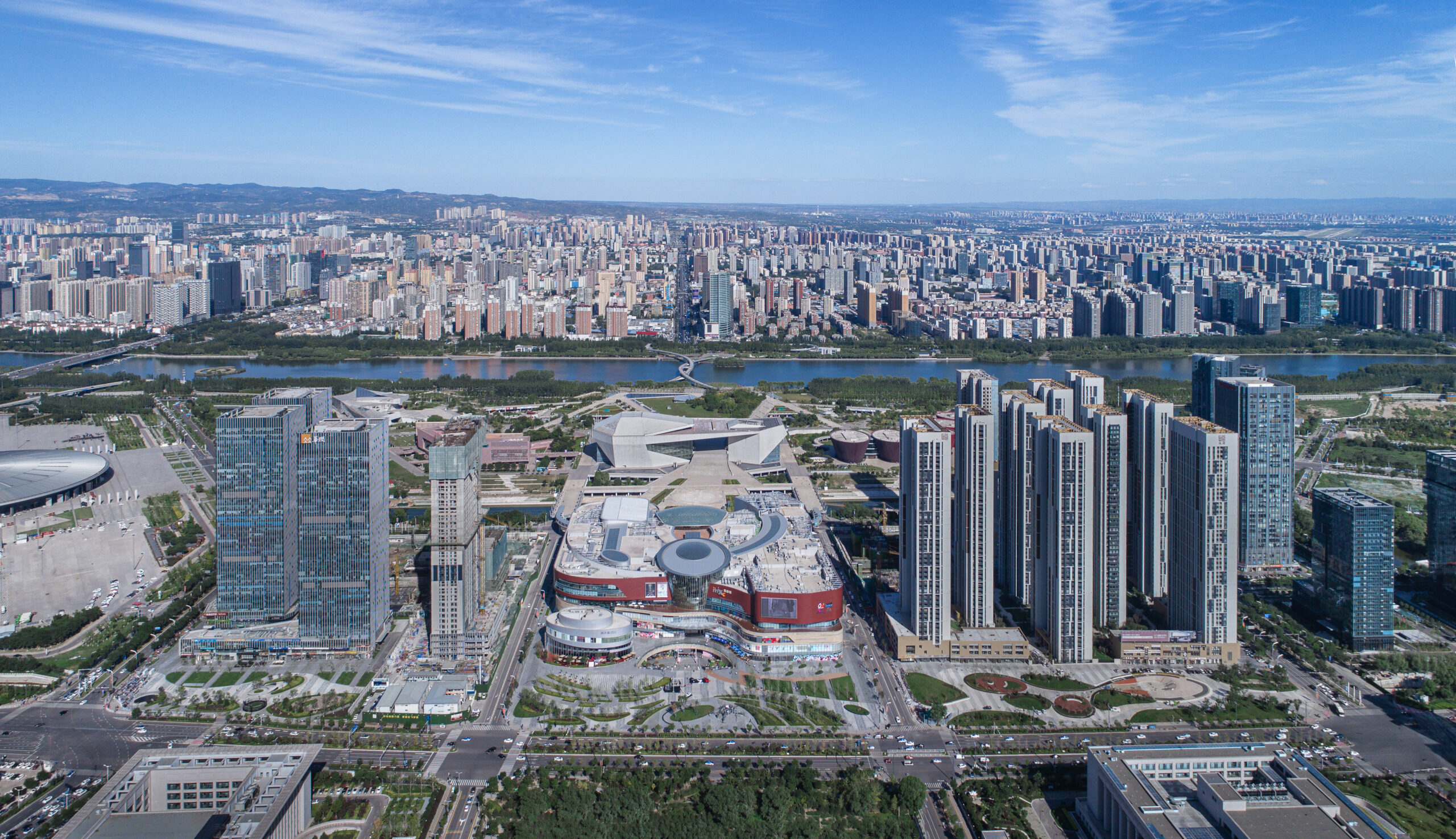 山西省太原市の長風文化ビジネス区の中央文化島に隣接する大型商業施設。文化島には博物館、劇場、科学技術ホールなどの文化施設が象徴的に配置され、その流れの中に本物件は位置する。また歴史的な街区と開発エリアの境界に位置することも施設の方向性を決める要因となった。この場にふさわしい風格のあるデザインが求められた。